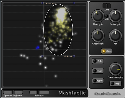 MashTactic was initially designed as a mashup tool. It can separate different parts of a full mix, manipulating different frequencies and stereo locations. Up to eight zones can be created that can then be panned, emphasised or cut out completely. It can be viewed as an eight band filter that exists in stereo ranges as well as frequency.